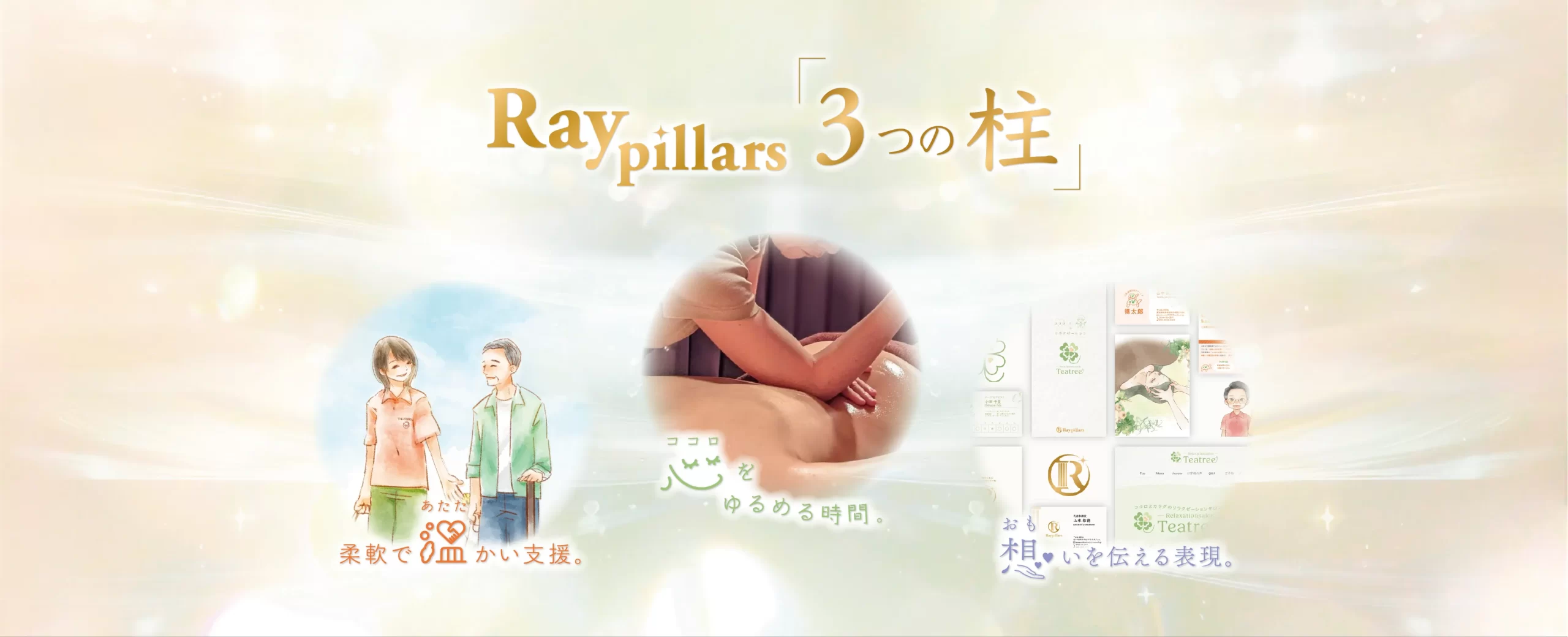 Ray pillars は、リラクゼーション、介護保険外サービス、広告デザイン事業など、ジャンルにとらわれず多角的事業を展開しています。