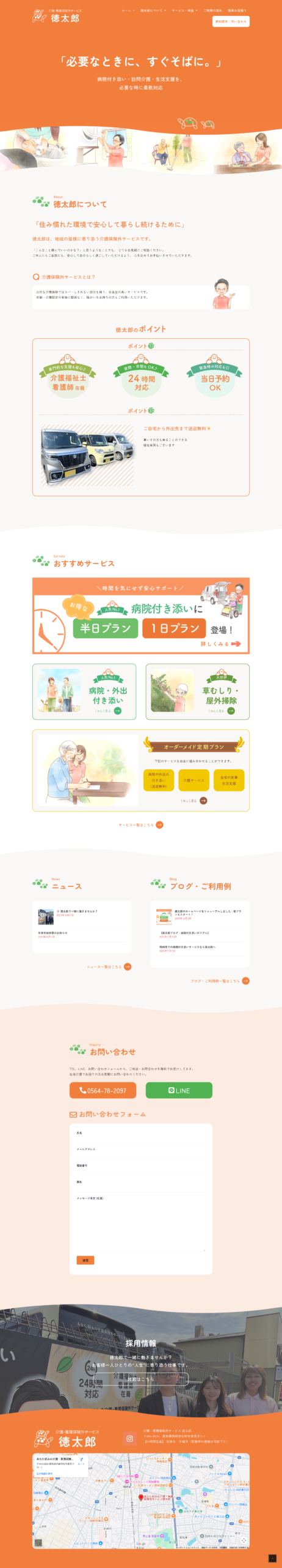 介護・看護保険外サービス 徳太郎 ホームページリニューアル 2025年12月5日 最終更新日時 : 2025年12月5日 raypillars 介護・看護保険外サービス 徳太郎 ターゲット Target 「ちょっと頼みたい」と思う方遠方で介護が難しい方在宅介護で困っている方 改善したいポイント Assignment サービス内容や情報をより整理して、さらにわかりやすく初めての方でも安心して相談できる印象にアップデート 制作の目的 新しいお客様にサービスを知ってもらうお問い合わせや相談につながる導線を整える Purpose 情報設計 Plan 直感的に理解できるレイアウトを意識重要な情報を一目で把握できるデザイン デザインプロセス Design あたたかみのあるオレンジを基調とした配色で安心感を演出親しみやすく、相談しやすい雰囲気に